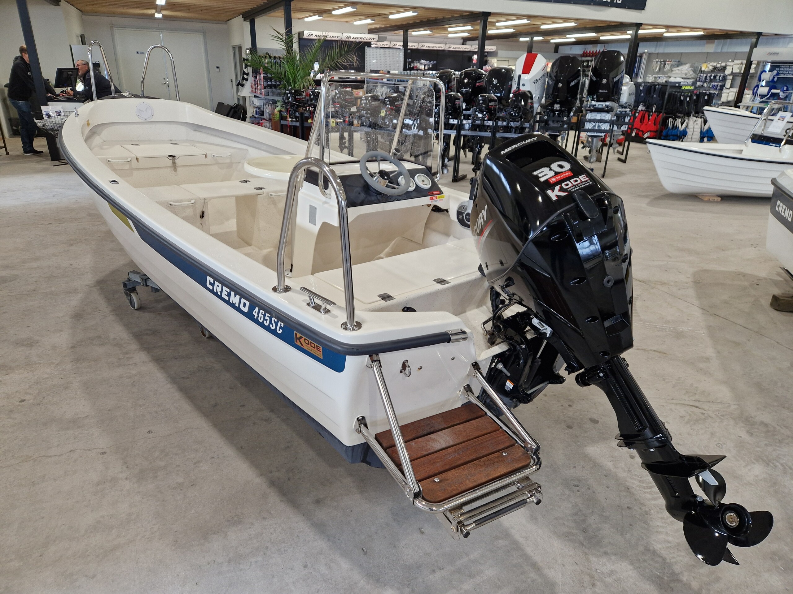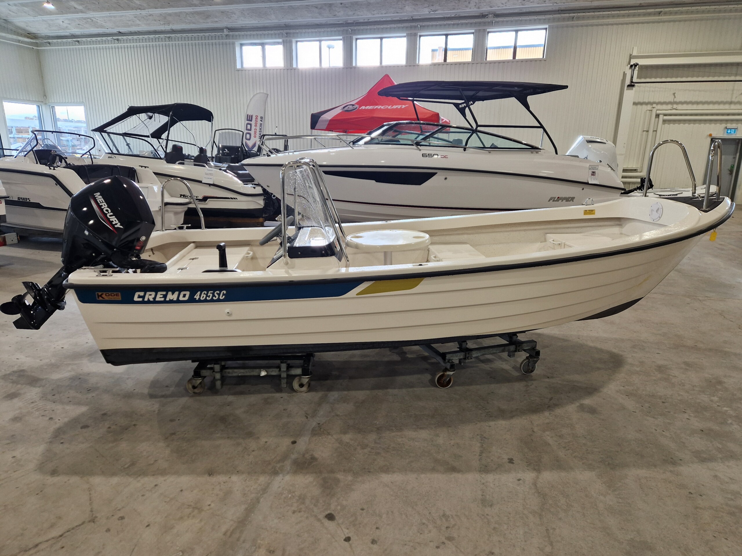Klassisk öppen styrpulpetare från Cremo med elstartad fyrtaktare med insprutning samt powertrim/tilt. Motorn är nyservad.