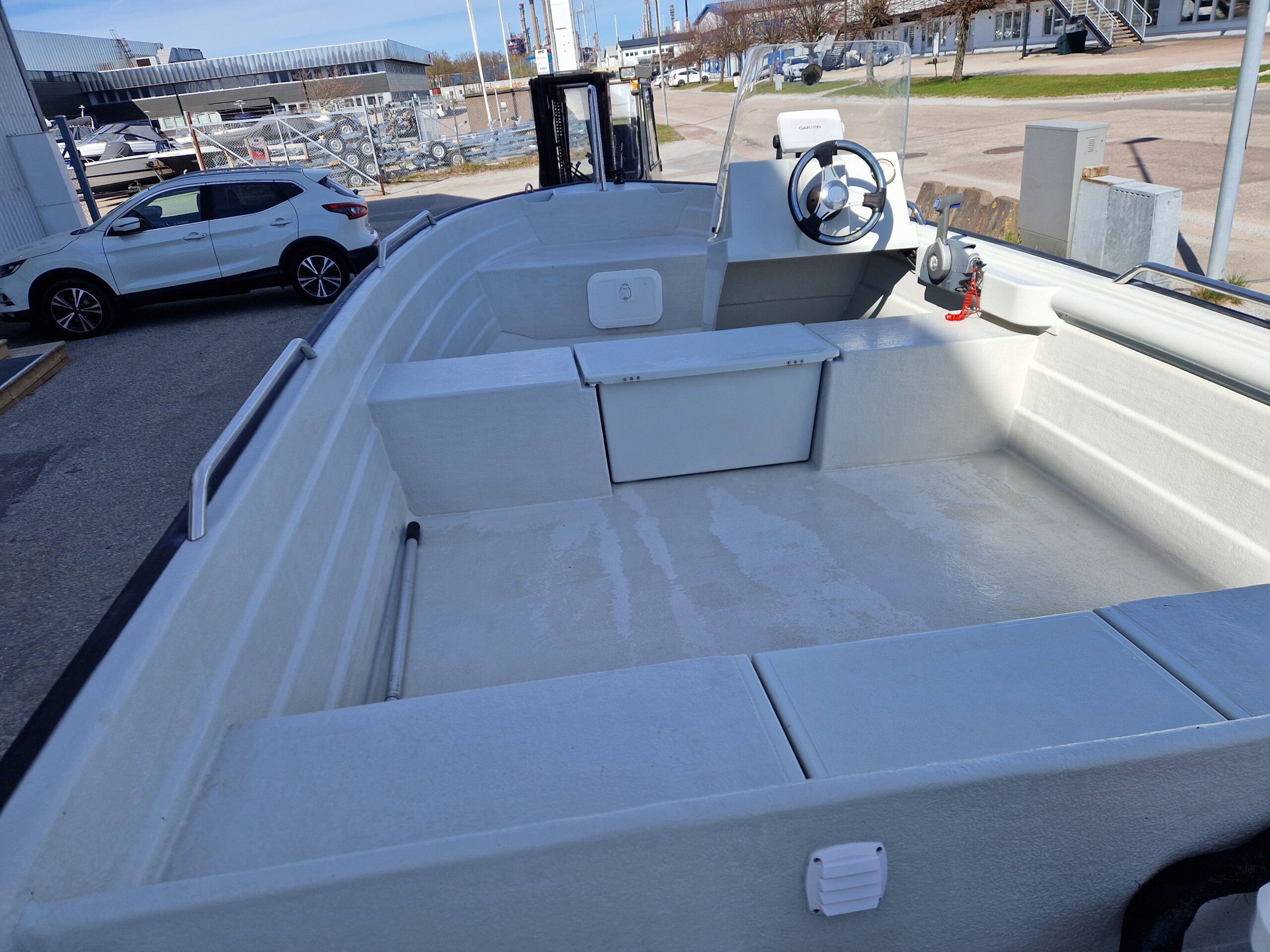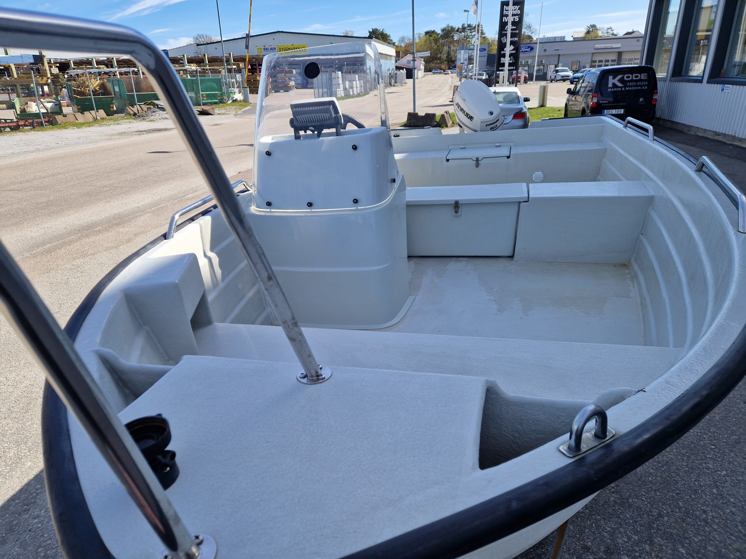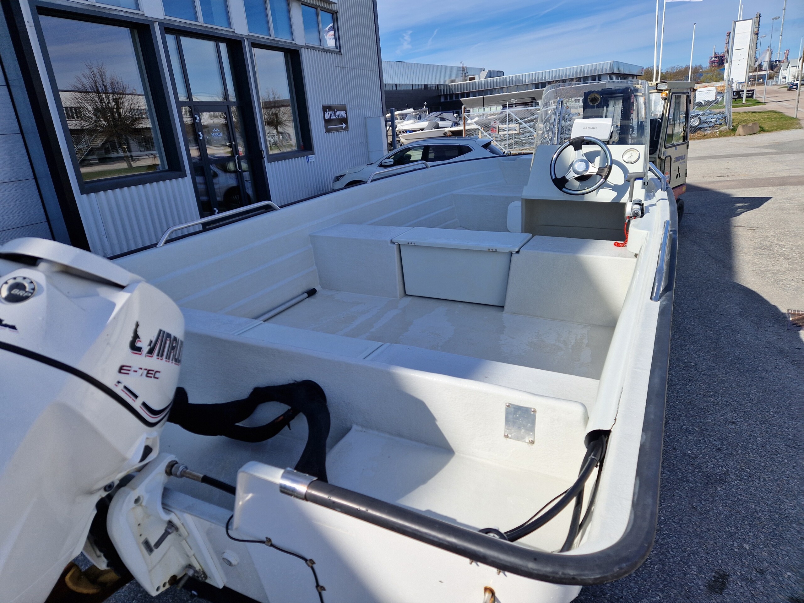 Utrustning: Badstege, Garmin GPS med ekolod, styrpulpet med ruta, hajfena i fören, handtag på relingen, låsögla klass tre samt varvräknare med motorkontrollampor.