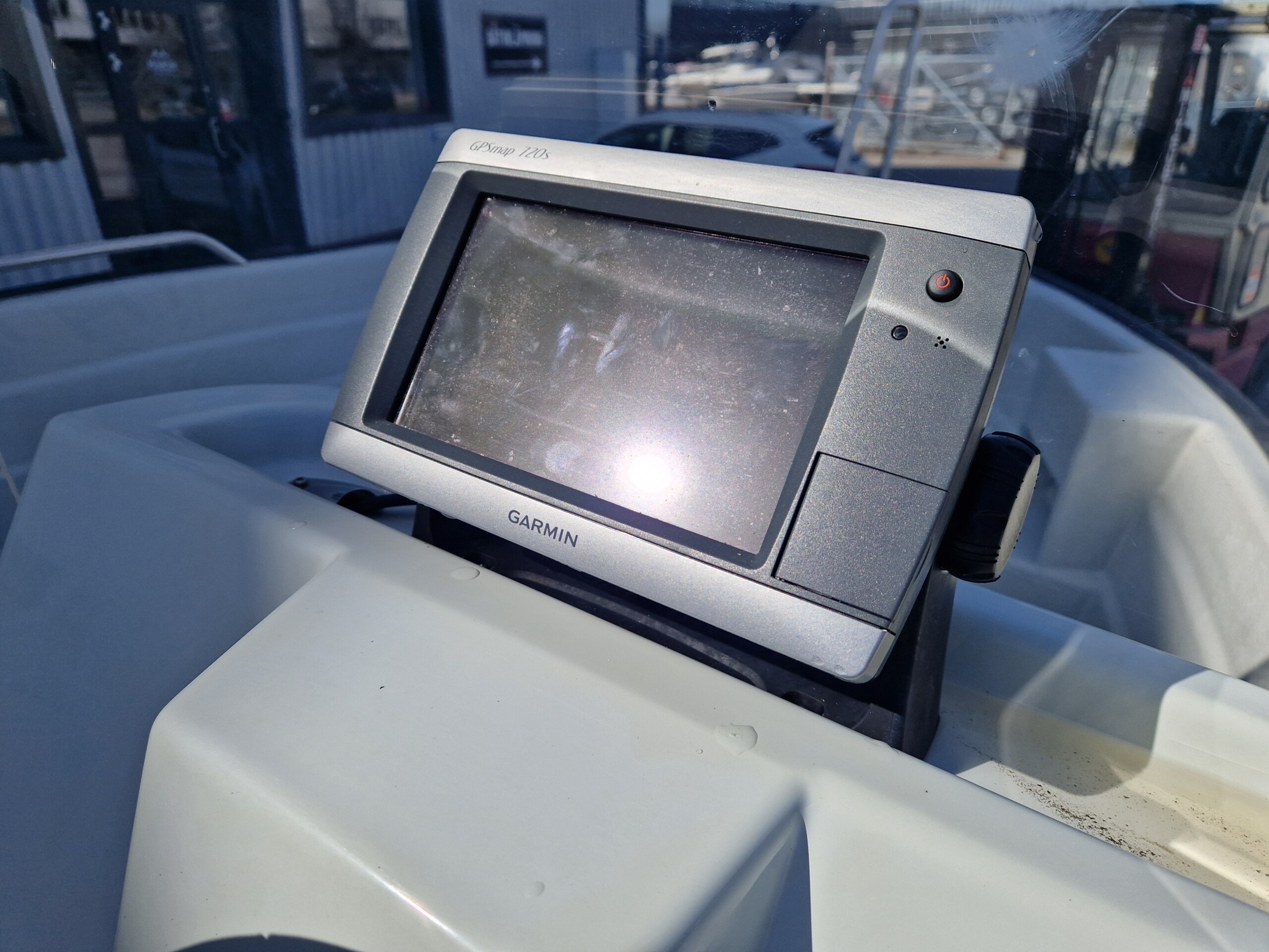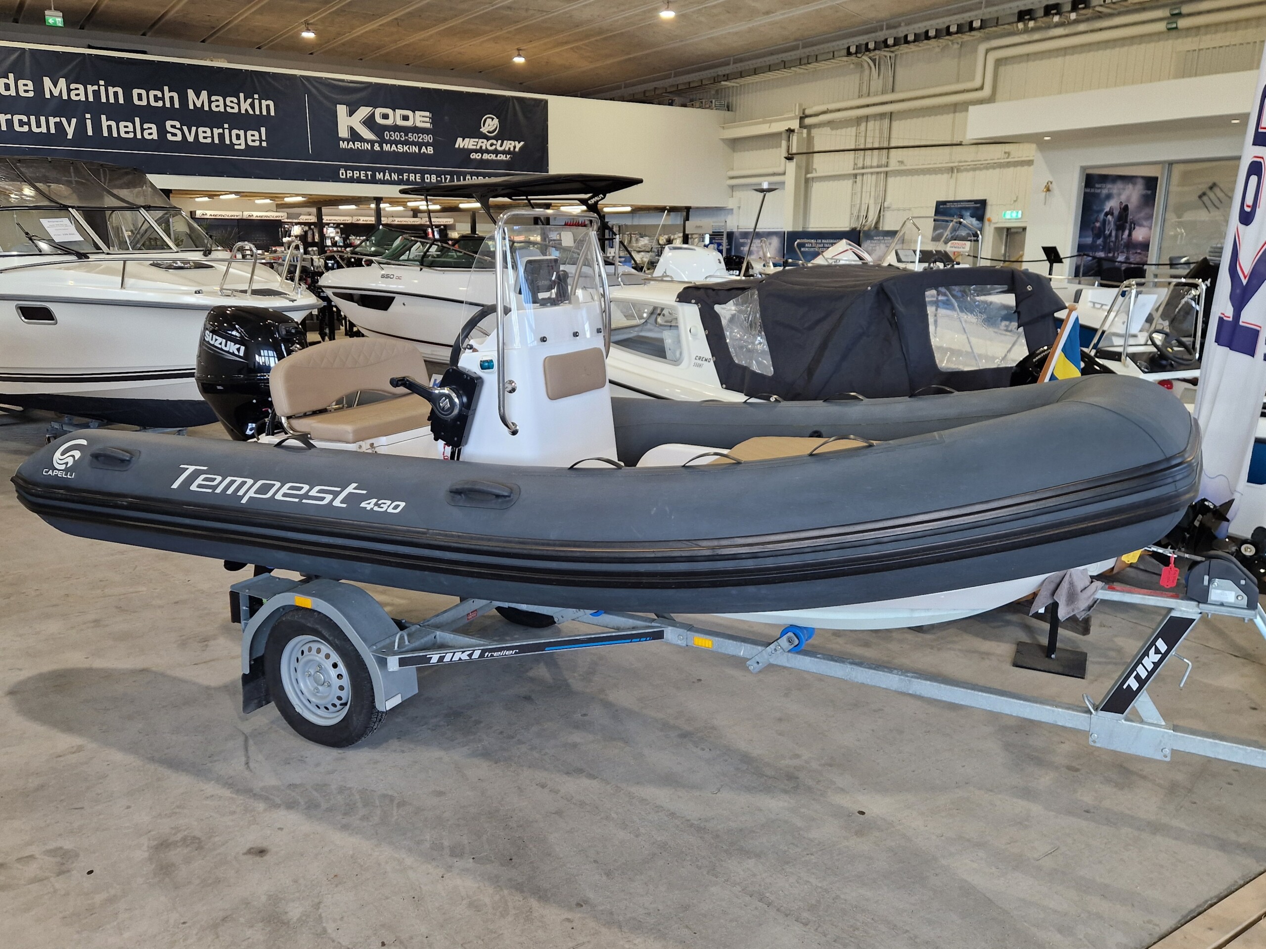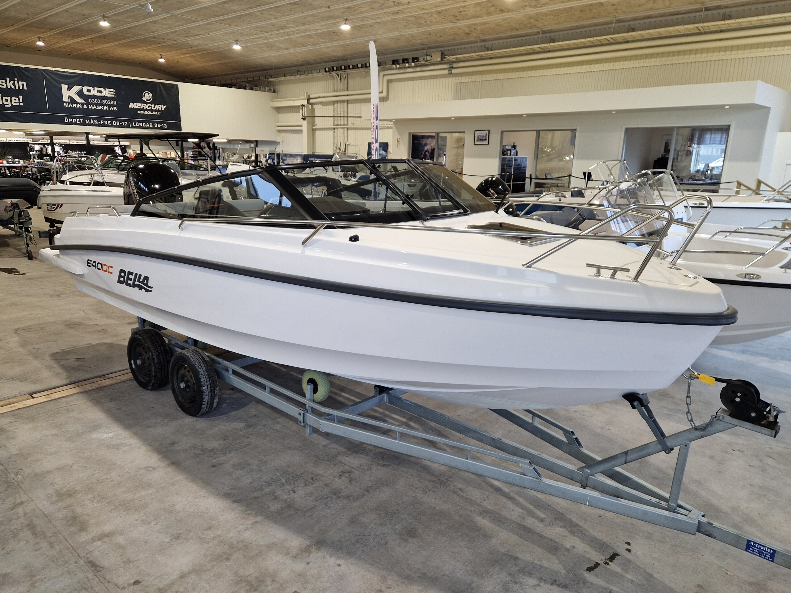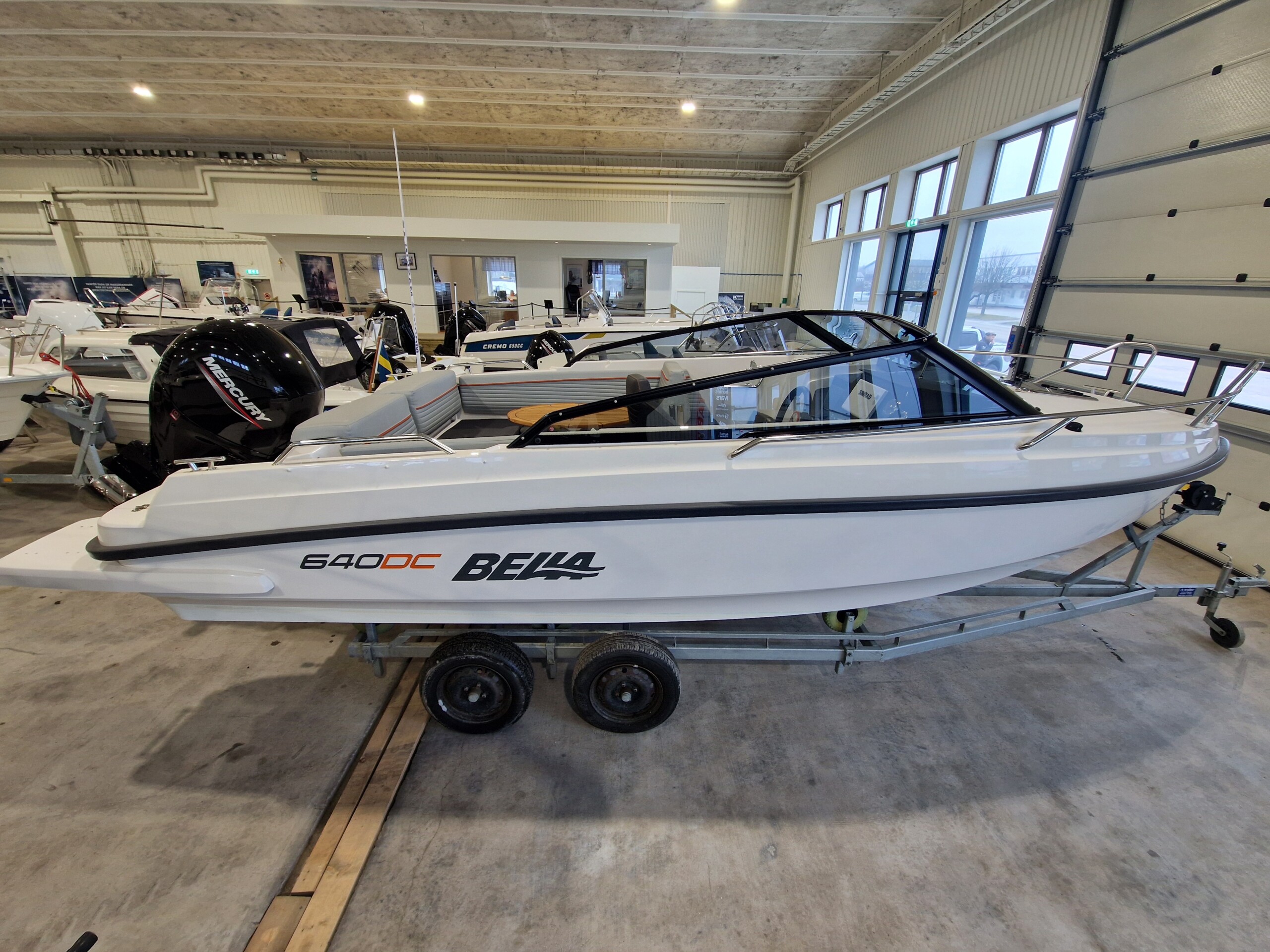 Utrustning: Badstege, Garmin GPS med ekolod, styrpulpet med ruta, hajfena i fören, handtag på relingen, låsögla klass tre samt varvräknare med motorkontrollampor.