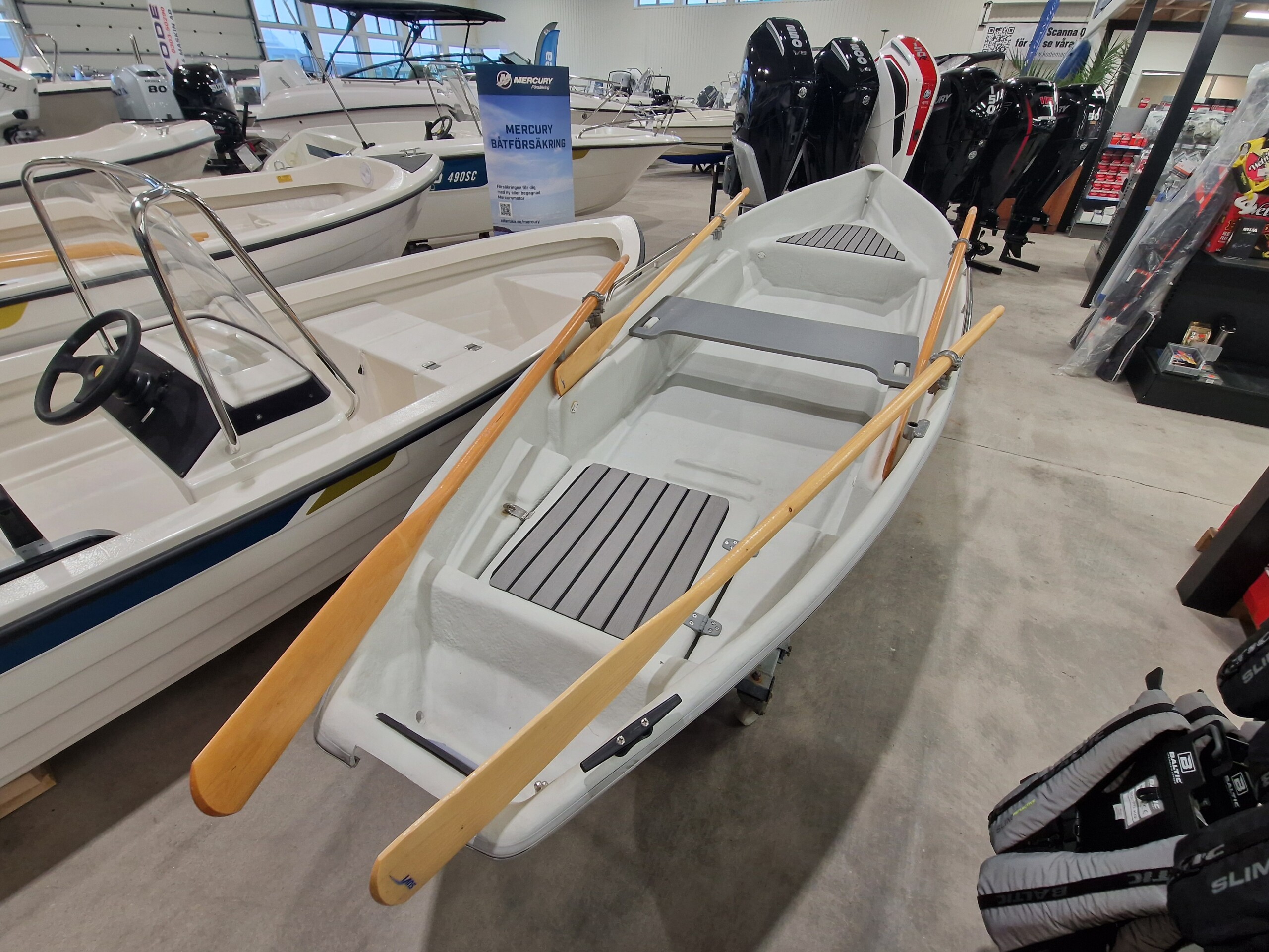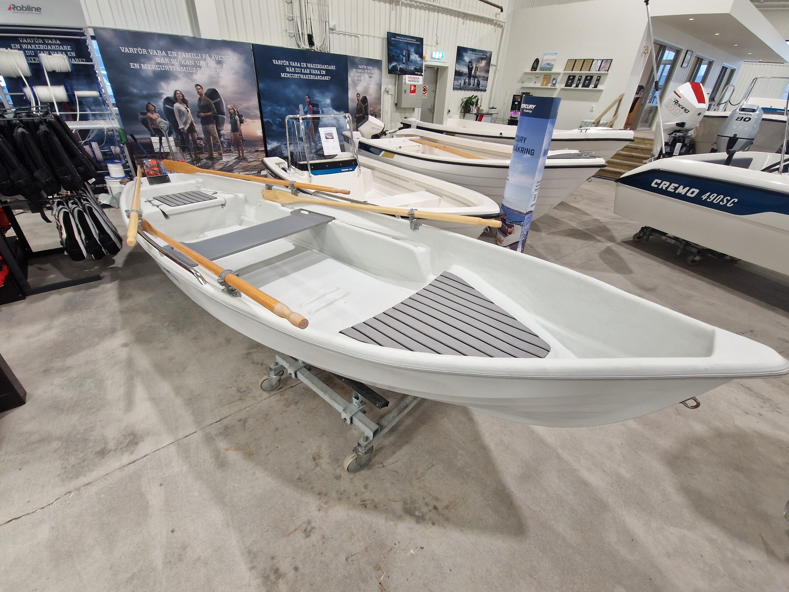 Utrustning: Dubbla årpar, rostfria räcken, durkmatta på sittplatser i för och akter, låsbart förvaringsfack i akter, löstagbar/flyttbar mittoft och smart bärhandtag i fören.